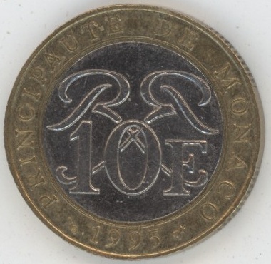 Monaco 10 Francs 1995 Rainier III (ss) Bi-Metallic KM# 163