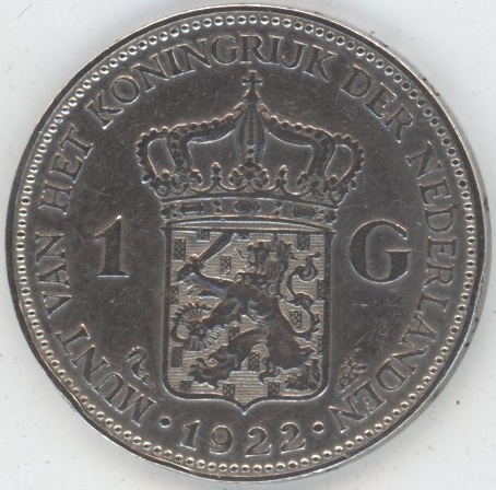 Pays-Bas 1 Gulden 1922 Wilhelmina I (ss+) en argent 0.720 (10gr) KM# 161