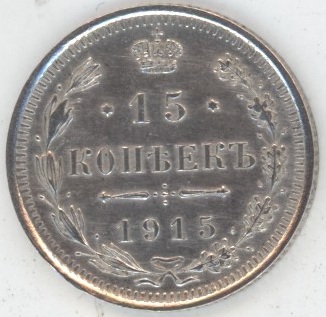 Russie 15 Kopeks 1915 СПБ ВС Nicholas II (ss-vz) en argent 0.500 (2.7gr) Y# 21a.2