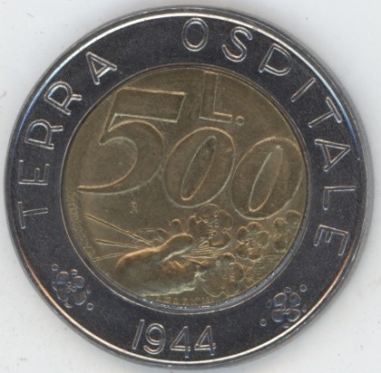 San Marino 500 Lire 1991 Terra Ospitale 1944 (vz) Bi-Metallic KM# 269