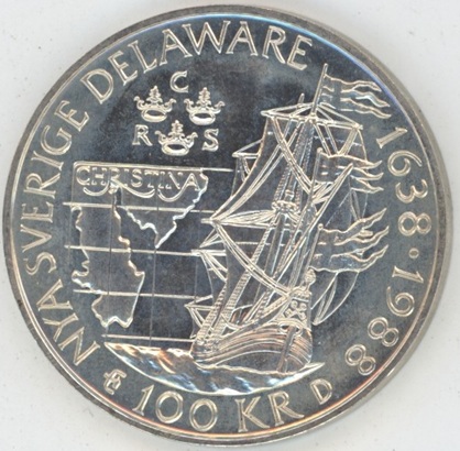 Suède 100 Kronor 1988 Carl XVI Gustaf (New Sweden Delaware) (vz) en argent 0.925 (16gr) KM# 867