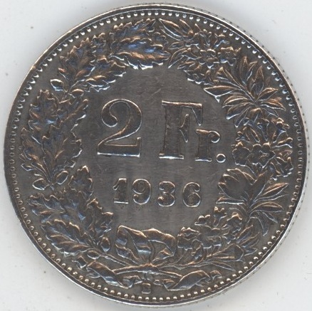 Suisse / Schweiz 2 Francs 1936 (ss) en argent 0.835 (10gr)