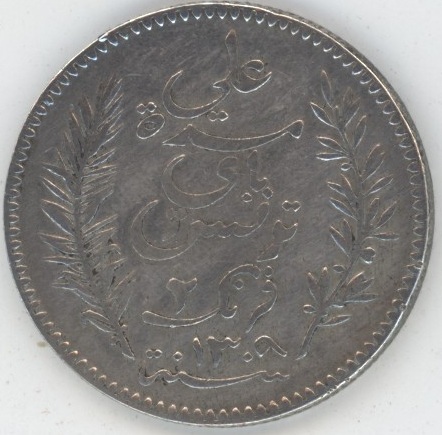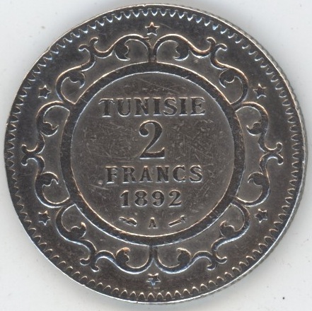 Tunisie 2 Francs 1892 Ali protectorat français (ss) en argent 0.835 (10gr) KM# 225