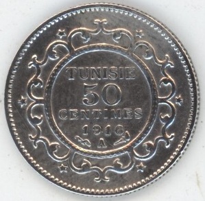 Tunisie protectorat français 50 Centimes ١٣٣٥ (1916) A (ss+) en argent 0.835 (2.5gr) KM# 237