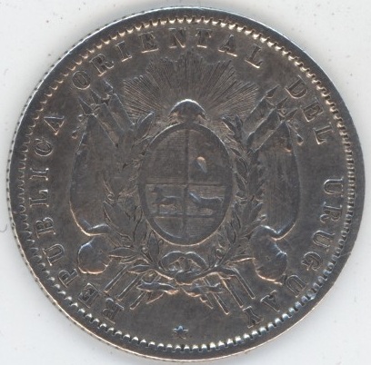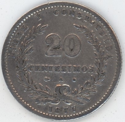 Uruguay 20 Centesimos 1877 A (ss) en argent 900 (5gr) KM# 15