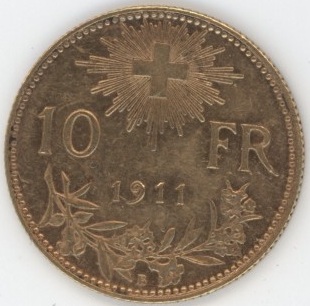 Suisse / Schweiz Vreneli 10 Francs OR 1911 (ss+) petite rayure sur la joue en or 0.900 (3.22gr)