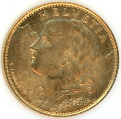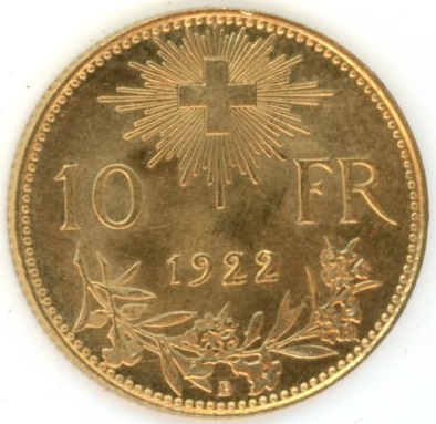 Suisse / Schweiz Vreneli 10 Francs OR 1922 (vz) en or 0.900 (3.22gr)