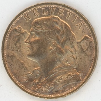 Suisse / Schweiz Vreneli 20 Francs OR 1927 (vz) petit coup sur la tranche en or 0.900 (6.45gr)
