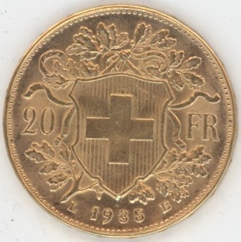 Suisse / Schweiz Vreneli 20 Francs OR 1935 LB (vz) en or 0.900 (6.45gr)